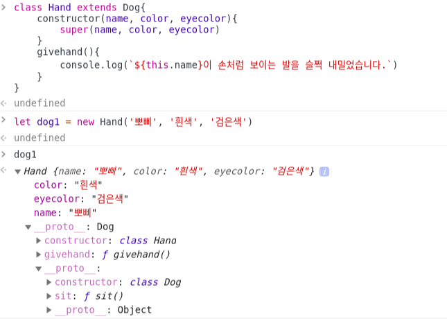 proto 항목을 보면, 먼저 뽀삐는 Dog를 가지고 있다. 또리의 상위는 Object였다. 또, 뽀삐는 Dog class에 있던
